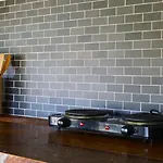 La cuisine complète, fournie dans l'établissement, comprend un réfrigérateur et de la vaisselle.